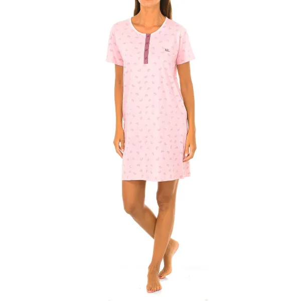 Nachtjapon met korte mouwen. Bedrukte roze kleur Ronde hals met geribde en geknoopte afwerking. Decoratieve print en geborduurde merkinitialen. Naden in toon zichtbaar. Samenstelling: 100% katoen Wasvoorschriften: -Wassen op max. temperatuur. 30ste. -Geen bleekmiddel gebruiken. -Niet strijken. -Kan niet chemisch gereinigd worden. - Gebruik van droger niet toegestaan.