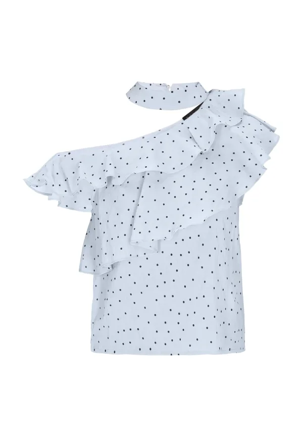 Blouse type: Blouseshirt; Design: Gevoerde zoom/rand; Type sluiting: Knoopsluiting; Materiaal: Chiffon; Motief: Gestippeld; Kraag: Opstaande kraag; Details: Cut-outs, Volant; Extra's: All-over patroon; Pasvorm: Normale pasvorm; Armlengte: Kwartmouw; Lengte: Normale lengte