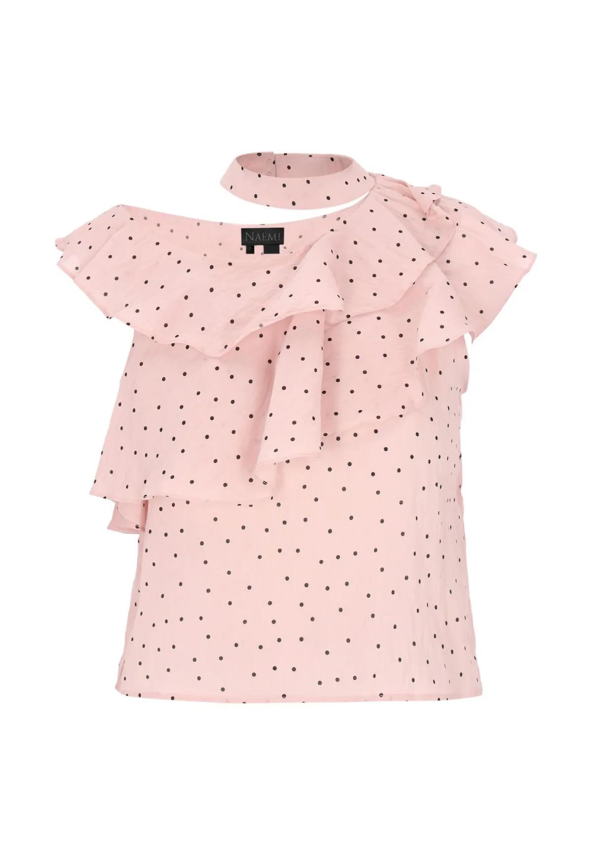 Blouse type: Blouseshirt; Design: Gevoerde zoom/rand; Type sluiting: Knoopsluiting; Materiaal: Chiffon; Motief: Gestippeld; Kraag: Opstaande kraag; Details: Cut-outs, Volant; Extra's: All-over patroon; Pasvorm: Normale pasvorm; Armlengte: Kwartmouw; Lengte: Normale lengte