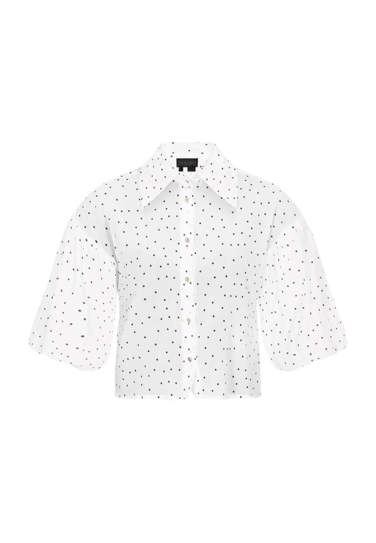 Blouse type: Blouseshirt; Design: Gevoerde zoom/rand; Type sluiting: Knoopsluiting; Materiaal: Chiffon; Motief: Gestippeld; Kraag: Kentkraag; Details: Gedrapeerd; Extra's: Lichte stof; Pasvorm: Normale pasvorm; Armlengte: Driekwart mouw; Lengte: Normale lengte