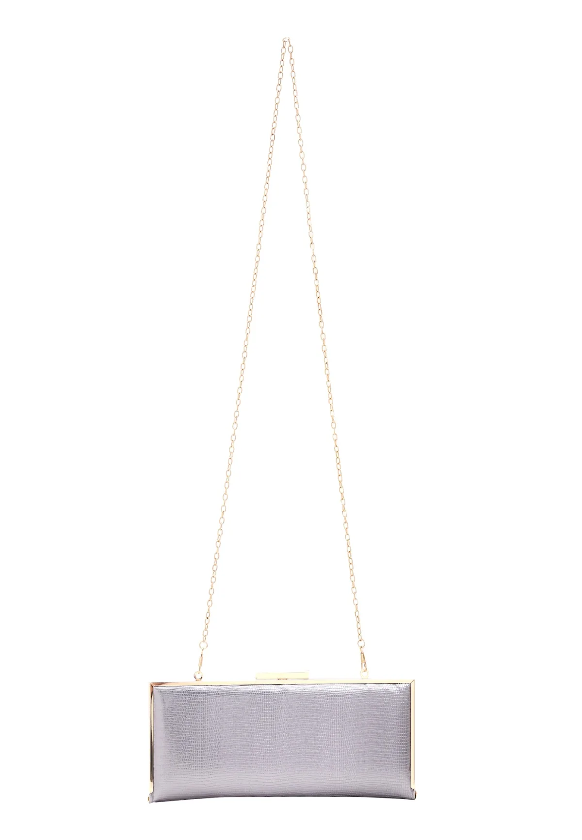 Verfraai je avondoutfit met deze kleine rechthoekige clutch met een chic slangenpatroon. Het gestructureerde ontwerp heeft een gespsluiting voor veiligheid en stijl, terwijl de kettingriem veelzijdig over de schouder te dragen is. Gevoerd met ecoleer straalt dit elegante accessoire verfijning en functionaliteit uit, perfect voor formele gelegenheden.