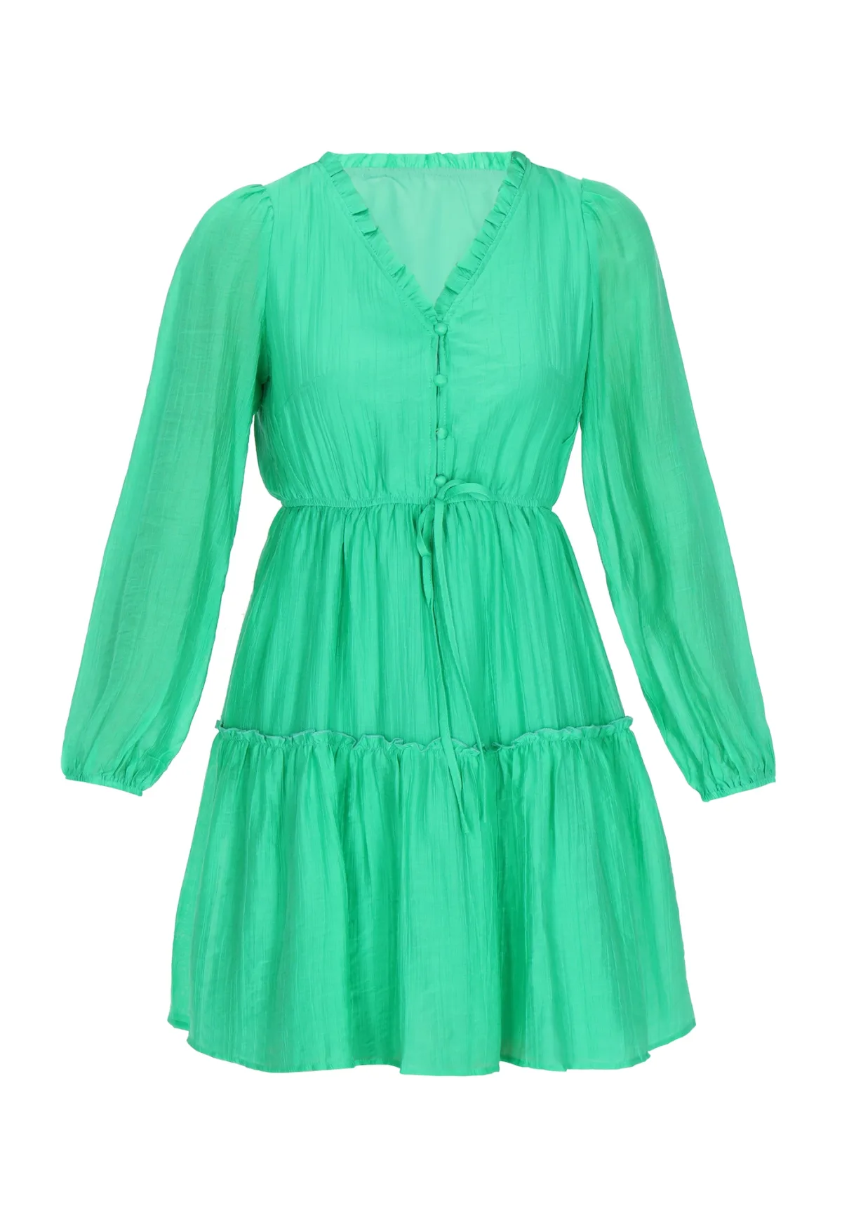 Een modieuze jurk met een V-hals en knoopsluiting aan de voorkant voor een chique look. Lange mouwen met elastische manchetten cre jurk