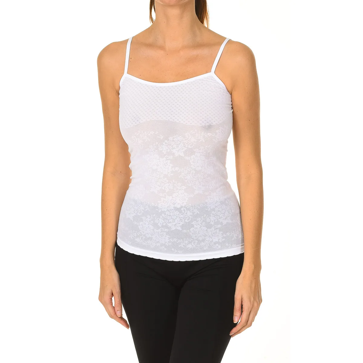 T-Shirt mit dünnen Trägern. weiße Farbe Aus Mikrofaser mit Spitzendesign. Ohne Stiche. Bequemer und atmungsaktiver Stoff. Zusammensetzung: 100 % Polyamid Handwäsche. Benutzen Sie keine Bleiche. Keinen Trockner verwenden. Kein Bügeln.