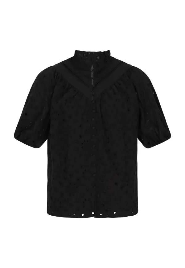 Blouse type: Klassieke blouse; Design: Pofmouwen; Type sluiting: Knoopsluiting; Materiaal: Katoen; Motief: Effen; Kraag: Opstaande kraag; Details: Ruches, Borduursels, Plooien, Mesh; Extra’s: Voelt zacht aan; Pasvorm: Losse pasvorm; Armlengte: Halve mouw; Lengte: Normale lengte
