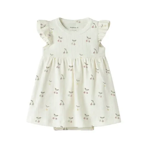 Deze witte baby jurk van katoen is een praktische basis voor elke dag. De jurk heeft een comfortabele A-lijn pasvorm, korte lengte en kapmouwtjes die de schouders zachtjes bedekken. De ronde hals met drukknoopsluiting in de nek maakt aan- en uittrekken makkelijk, ook bij de allerkleinsten.Zachte details voor de allerkleinsten Gemaakt van 95% katoen / 5% elastaan, voelt zacht aan op de gevoelige babyhuid Rekbaar materiaal waardoor je baby vrij kan bewegen A-lijn model dat luchtig valt en genoeg ruimte biedt bij buik en heupen Korte kapmouwen voor een lichte bedekking van de bovenarmen Ruches en plooien geven de jurk een verzorgde uitstraling All over print over de hele jurk voor een rustige, samenhangende look Drukknoopsluiting achter in de hals om snel te kunnen verschonen Geschikt voor baby en new born maten binnen de dagelijkse collectiePraktisch voor elke dagDeze jurk uit de Daily collectie is geschikt voor dagelijks gebruik. De soepele stof en de eenvoudige drukknoopsluiting maken verschonen en omkleden gemakkelijk. Draag de jurk op warme dagen los met blote beentjes of combineer met een legging wanneer het iets frisser is.NAME IT BABY voor comfortabele kinderkledingNAME IT BABY richt zich op kleding voor de allerkleinsten, met aandacht voor draagcomfort en pasvorm. De ontwerpen sluiten aan bij het dagelijkse leven met een baby en zijn afgestemd op veel bewegen, spelen en slapen. Zo kies je voor een jurk die er verzorgd uitziet en praktisch is in gebruik.Een comfortabele jurk waarin je baby zich de hele dag vrij kan bewegen.