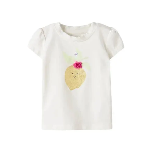 Voor een zachte, comfortabele look voor de allerkleinsten is dit baby T-shirt met korte mouwen een praktische basic voor iedere dag. Het shirt komt uit de NAME IT BABY lijn en is speciaal ontworpen voor baby’s en newborns. De zachte witte kleur vormt een rustige basis, terwijl de printopdruk en 3D applicatie zorgen voor een speels detail.Praktische details voor kleine ontdekkers Gemaakt van 95% katoen en 5% elastaan, waardoor de stof zacht en licht rekbaar is Korte, rechte mouwen, ideaal voor dagelijks gebruik in huis of onderweg Ronde hals met drukknoopsluiting, zodat het T-shirt makkelijk over het hoofdje gaat Printopdruk met 3D applicatie voor een extra speels effect Golvende afwerking en plooitjes geven het shirt een meisjesachtige uitstraling Maatadvies: dit artikel valt normaal binnen de baby en newborn maatboog Wasvoorschrift: handwas, niet strijken en niet drogen in de droogtrommelZacht T-shirt voor elke dagHet T-shirt is geschikt voor dagelijks dragen, of je nu thuis bent of een dagje op pad gaat. De lichte stretch zorgt dat je baby vrij kan bewegen, terwijl de drukknoopjes aankleden en verschonen eenvoudiger maken.NAME IT voor de allerkleinstenNAME IT BABY ontwerpt kleding speciaal voor baby’s, met aandacht voor zachte materialen, draagcomfort en doordachte details. Zo kun jij vertrouwen op basics met een prettige pasvorm die steeds opnieuw makkelijk uit de kast te pakken zijn.Een comfortabel T-shirt dat klaar ligt voor elke dag.