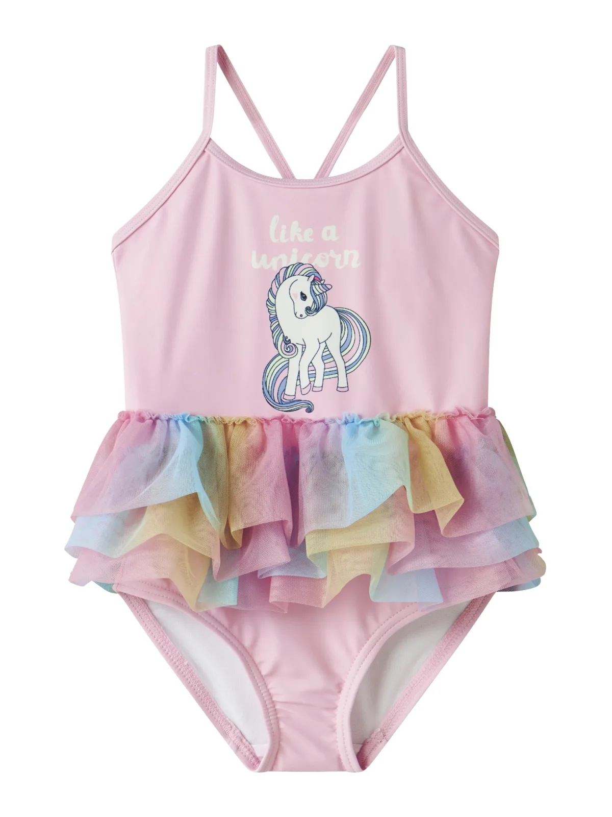 Specificaties: NAME IT Badpak ‘NMFZUPA’ lichtblauw / geel / rosa / wit