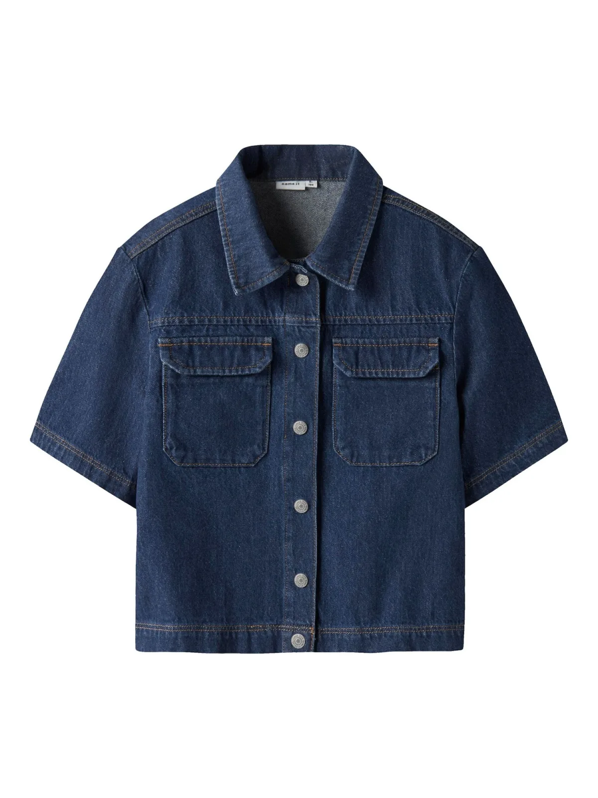Design: Knop placket, Opgezette zakken; Type sluiting: Knoopsluiting; Materiaal: Denim; Motief: Effen; Kraag: Kentkraag; Extra's: Contrasterende naden; Pasvorm: Losse pasvorm; Armlengte: Halve mouw; Lengte: Normale lengte