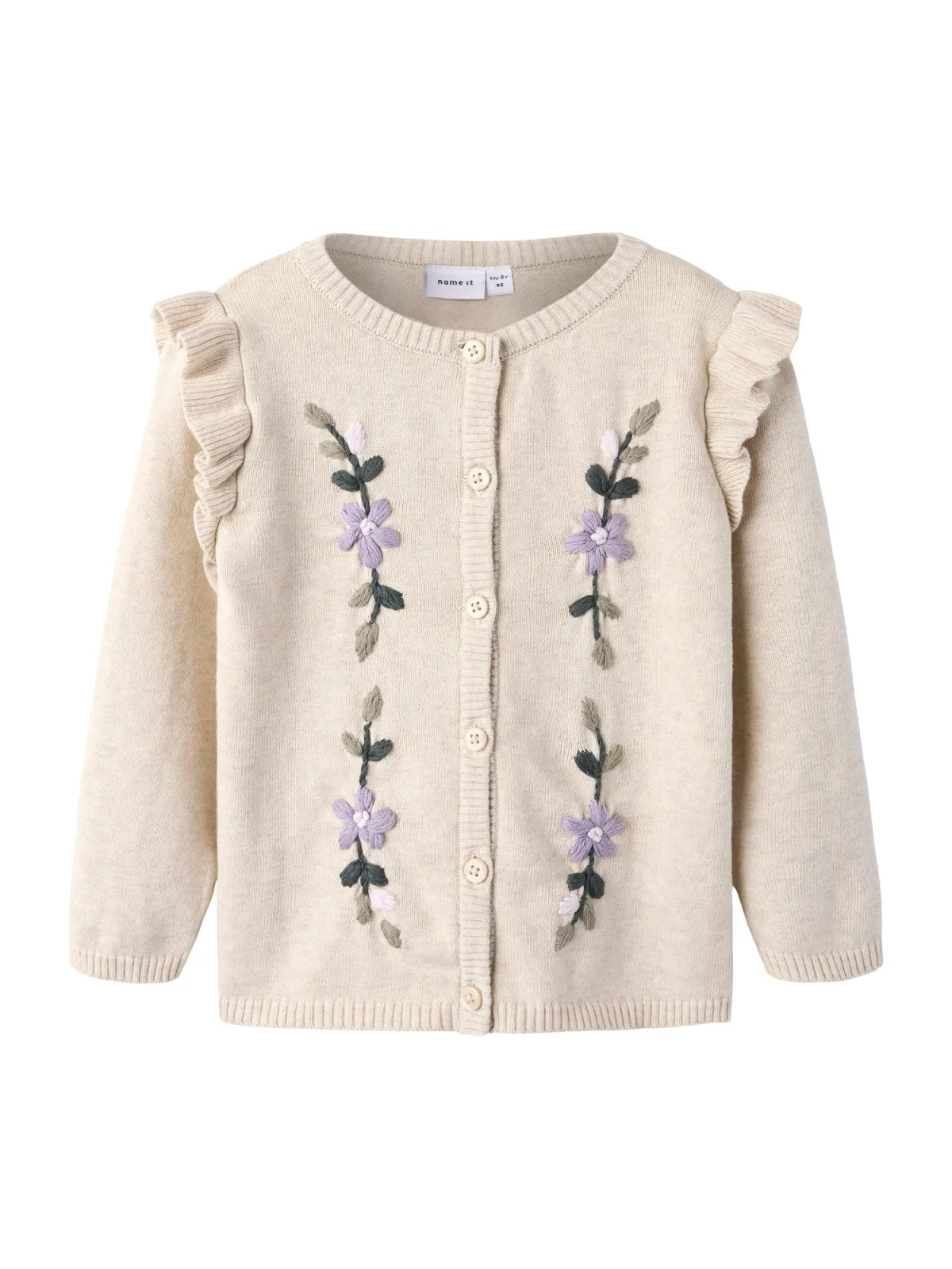 Design: Geribbelde kraag, Knop placket, Geribd ceintuurtje; Type sluiting: Knoopsluiting; Materiaal: Knitwear; Halstype: Ronde hals; Motief: Bloemenprint; Details: Ruches, Borduursels; Extra's: Fully fashioned, Voelt zacht aan; Pasvorm: Normale pasvorm; Armlengte: Lange mouw; Lengte: Normale lengte