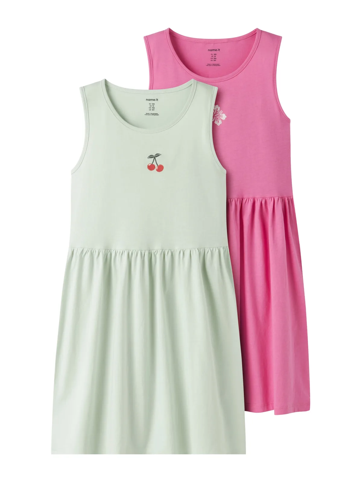 Klaar voor zonnige dagen met deze speelse NAME IT meisjes jurk set met twee mouwloze zomerjurken. De felroze en mintgroene tinten vallen direct op en de vrolijke printopdrukken met borduursels geven elke outfit een frisse, verzorgde uitstraling. Dankzij de midi lengte bewegen kinderen vrij, terwijl de ronde hals en rechte schouderlijnen comfortabel aanvoelen.Twee favoriete jurken in één set Set van twee jurken, handig om af te wisselen tijdens schooldagen en vrije tijd Gemaakt van 100% katoen, voelt zacht aan op de huid en is prettig om de hele dag te dragen Mouwloos model, ideaal voor warm weer of met een vestje erover op koelere dagen Midi lengte die goed valt en voldoende bewegingsvrijheid geeft Zonder sluiting, de jurk wordt eenvoudig over het hoofd aangetrokken Geschikt voor verschillende leeftijden, van baby tot tiener Wasbaar op 40 graden en warm strijkbaar, zo is de jurk snel weer klaar voor gebruikElke dag een frisse zomerlookDeze jurken zijn gemaakt voor dagelijks draagplezier. Van school tot speeltuin en van kinderfeestje tot vakantie, de kleuren en prints zorgen steeds weer voor een vrolijke look. Het maatadvies is dat de pasvorm normaal is, waardoor je gewoon de gebruikelijke maat kunt kiezen.Speelse kindermode van NAME ITNAME IT maakt kinderkleding met aandacht voor comfort en een eigentijdse uitstraling. De ontwerpen sluiten aan bij wat kinderen graag dragen en wat ouders praktisch vinden. Met deze jurkenset haal je toegankelijke, betrouwbare kindermode in huis, die makkelijk te combineren en te onderhouden is.Een kleurrijke set waarmee aankleden elke dag weer eenvoudig en leuk wordt.