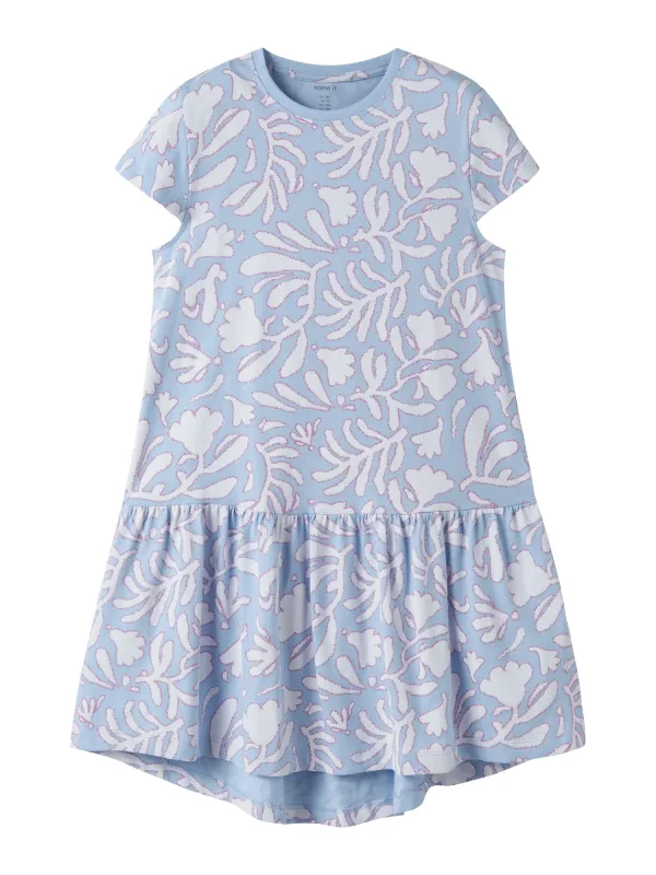 Deze lichtblauw met witte meisjes jurk van katoen van NAME IT is een praktische basic voor elke dag. De jurk heeft een speelse all over print en een luchtige pasvorm, ideaal voor schooldagen, speelafspraken of een dagje weg. De zachte, 100% katoenen stof voelt prettig aan op de huid en beweegt makkelijk mee, zodat je kind zich vrij kan blijven bewegen.Lichte jurk met speelse details Gemaakt van 100% katoen, voelt zacht en comfortabel aan Lichtblauw/witte all over print voor een frisse, zomerse look Korte mouwen en rechte mouwinzet, fijn voor de warmere dagen Volant detail voor een zwierig effect bij elke stap Ronde hals zonder sluiting, makkelijk aan en uit te trekken Valt normaal volgens het maatadvies, geschikt voor schoolkind en tiener Wasbaar op 40 graden en warm strijkbaar, onderhoudsvriendelijk in gebruik Niet geschikt voor de droogtrommel, zo blijft de stof langer mooiVoor alledaagse momentenDeze jurk uit de Daily collectie is gemaakt voor al die gewone dagen die toch speciaal voelen. Combineer met sandalen of sneakers en een vestje op frissere dagen. Door het ontbreken van zakken oogt de jurk rustig en blijft de print centraal staan.NAME IT KIDS voor moderne kidskledingNAME IT KIDS ontwerpt kinderkleding met oog voor comfort, pasvorm en herkenbare stijlen. De collecties sluiten aan bij wat kinderen graag dragen en wat ouders praktisch vinden. Zo haal je met deze jurk een kledingstuk in huis dat er goed uitziet en prettig draagt.Een luchtige, vrolijke jurk voor elke dag.