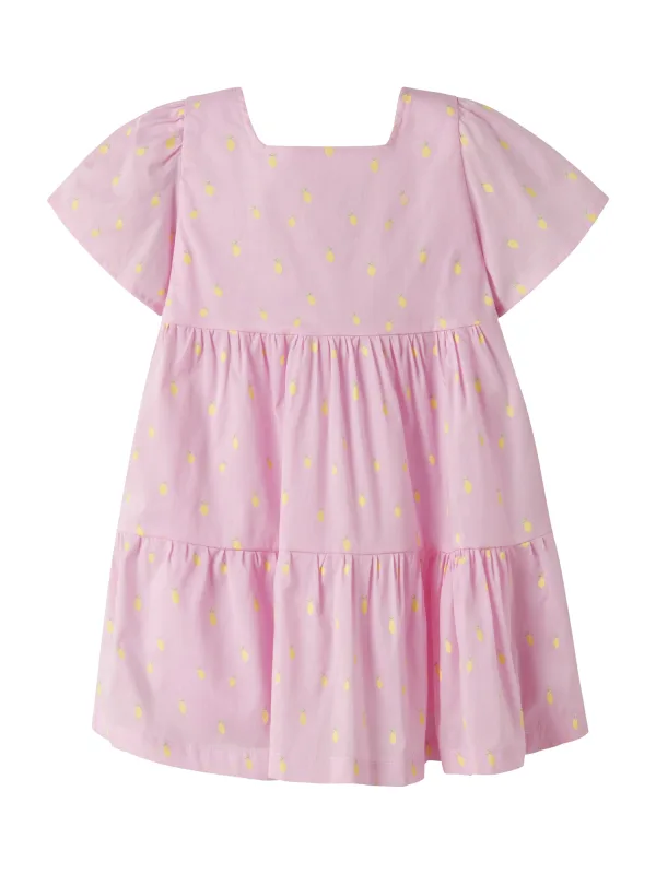 Deze jurk met ruches heeft een vrolijke fruitprint die je meteen in een goed humeur brengt. De ronde halslijn heeft een klassieke en comfortabele uitstraling. Een elastische inzet op de rug zorgt voor optimale bewegingsvrijheid. De vierkante halslijn aan de voorkant zorgt voor een charmant accent. De korte, licht pofmouwtjes geven de jurk een speelse touch. Een afgezette rok zwiert met elke beweging mee. Het materiaal is heerlijk licht en comfortabel om te dragen. Het ontwerp combineert comfort en kindvriendelijke elegantie. Een geweven label aan de binnenkant is een teken van liefdevol vakmanschap. Een jurk die kleine meisjes elke dag zullen willen dragen.