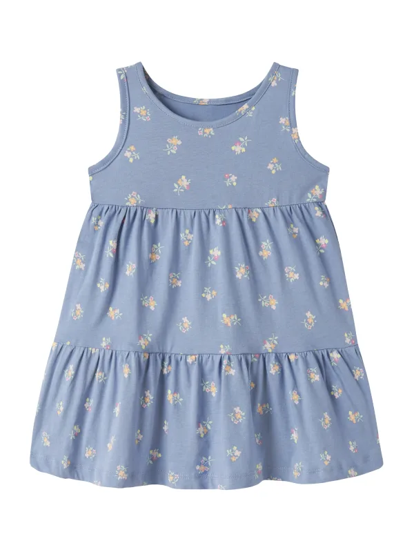 Fris, licht en speels, deze katoenen meisjes zomerjurk van NAME IT MINI is gemaakt voor zonnige dagen en drukke ontdekkingsreizigers. De jurk heeft een paarsblauwe kleur met een vrolijke bloemenprint en valt in een comfortabele midi lengte. Dankzij het trapeze model valt hij mooi los om het lichaam, zodat er volop ruimte is om te rennen, klimmen en spelen.Luchtig model voor warme dagen Gemaakt van 100% katoen, een zachte stof die prettig aanvoelt op de huid Mouwloos model dat veel bewegingsvrijheid geeft Ronde hals voor een rustige, kindvriendelijke look Zonder sluiting, waardoor de jurk eenvoudig aan en uit te trekken is Midi lengte en trapeze silhouet voor een speelse, zwierige val Paarsblauwe basis met bloemenprint die direct opvalt Geschikt voor peuters, kleuters en schoolkinderen Dit artikel valt normaal, handig bij het kiezen van de maat Wasbaar op 40 graden, niet drogen in de droogtrommel en warm strijkbaar (2 punten)Klaar voor elke gewone dagDeze jurk komt uit de 'Daily' collectie en is ideaal voor alledaagse momenten zoals school, spelen in de tuin of een bezoekje aan opa en oma. Combineer met sandalen of sneakers en een vestje op koelere dagen.Speelse kinderkleding van NAME ITNAME IT maakt kinderkleding met aandacht voor comfort, pasvorm en draaggemak. De collecties sluiten aan bij het dagelijks leven van kinderen, met materialen die fijn aanvoelen en ontwerpen waarin makkelijk bewogen kan worden. Zo krijgt je kind kleding die prettig zit en er tegelijk modern uitziet.Een fijne jurk voor elke dag waarop spel en comfort centraal staan.