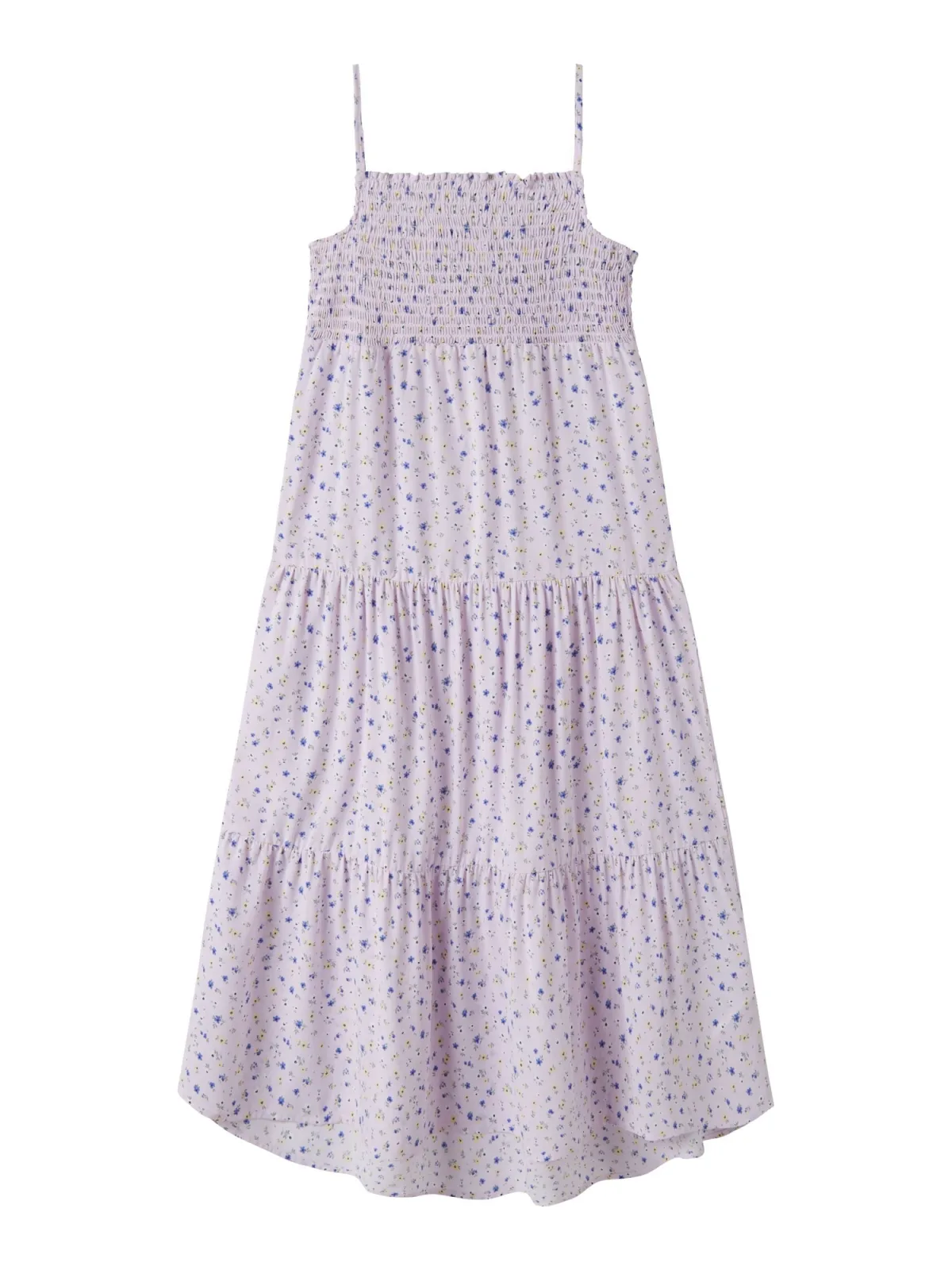 Materiaal: Gerecycled materiaal; Halstype: Carréhals; Motief: Bloemenprint; Soort bandjes: Spaghettibandjes; Details: Volant, Gedrapeerd; Extra's: All-over patroon, Fully fashioned; Lengte: 3/4 lengte; Snit: Uitlopend; Pasvorm: Normale pasvorm; Armlengte: Mouwloos