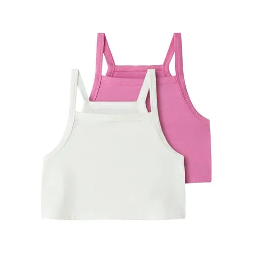Deze set van twee cropped tops voor meisjes van NAME IT is ideaal voor zonnige dagen en relaxte outfits. De NKFVILINA tops hebben een speelse cropped lengte en komen in roze en wit. Door de vierkante hals en de fijne spaghettibandjes ontstaat een luchtige look die makkelijk te combineren is met een korte broek, een rok of een wijde jeans.Cropped tops voor elke dag Set van 2: één roze en één witte top, handig als basis in de kast Cropped model: valt kort op de heup voor een moderne, speelse look Spaghettibandjes: dunne bandjes die licht aanvoelen op de huid Vierkante hals: geeft een rustige en eigentijdse uitstraling Zachte stretchstof: gemaakt van katoen met elastaan voor een soepele pasvorm Geschikt voor schoolkind en tiener, onderdeel van de daily collectieMakkelijk te dragen en te stylenDe NKFVILINA tops zijn fijne basics voor elke dag. Draag ze op een hoge jeans of een luchtige short, met een open blouse of vest erover als het wat frisser is. Door de effen kleuren passen de tops eenvoudig bij de rest van de garderobe en zijn ze snel favoriet voor school, vrije tijd of vakantie.NAME IT voor speelse kinderoutfitsNAME IT ontwerpt comfortabele kleding voor kinderen die graag bewegen en zichzelf willen zijn. Met aandacht voor pasvorm, zachte materialen en eigentijdse details creëren zij kleding die prettig draagt en er modern uitziet. Zo krijgt elke dag een praktische en toch stijlvolle basis.Een veelzijdige set die moeiteloos meegroeit met de dagelijkse avonturen.