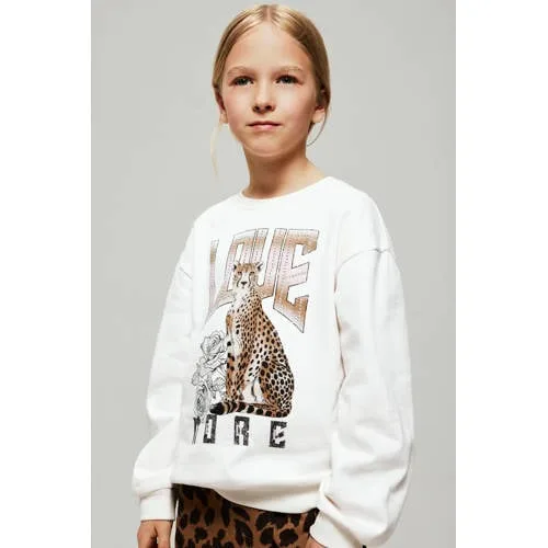 Design: Geribbelde kraag, Geribd ceintuurtje; Materiaal: Sweatstof; Halstype: Ronde hals; Motief: Motiefprint; Details: Sierstenen; Extra's: Studs, Glitterend; Pasvorm: Normale pasvorm; Armlengte: Lange mouw; Lengte: Normale lengte