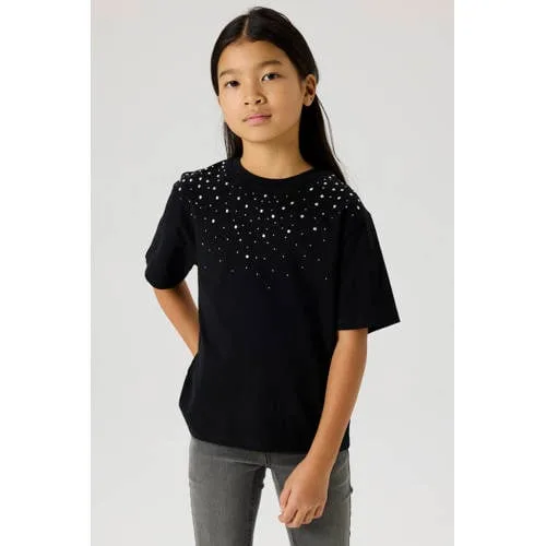 Voeg een stoere basis toe aan de garderobe met dit NAME IT meisjes T-shirt NKFBEA. Het zwarte T-shirt heeft een all over print die direct opvalt, aangevuld met subtiele strass steentjes voor een speelse glans. Dankzij de regular fit en de ronde hals zit het shirt comfortabel en oogt het tegelijk modern. Gemaakt van 100% katoen voelt het zacht aan op de huid, ideaal voor elke dag.Details die het verschil maken Kleur zwart met all over print voor een eigentijdse look Strass steentjes op de voorkant voor een lichte, glinsterende finish Regular fit, valt volgens de aangegeven maat, dus eenvoudig de normale maat kiezen Korte, rechte mouwen en ronde hals, geschikt voor het hele jaar door Gemaakt van 100% katoen, wat prettig aanvoelt tijdens het dragen Eén T-shirt in de verpakking, handig als favoriet basisitemElke dag draagbaar en makkelijk te combinerenDit T-shirt past net zo goed bij een korte broek als onder een vest of spijkerjasje. Ideaal voor school, spelen of een familiedag, het shirt biedt volop bewegingsvrijheid door de regular pasvorm en het soepele katoen.NAME IT KIDS voor alledaags gemakNAME IT KIDS ontwerpt kleding speciaal voor kinderen, met aandacht voor draagcomfort en eigentijdse details. De collectie sluit aan bij wat kinderen graag dragen en wat ouders praktisch vinden, zodat er elke dag een passende outfit klaarhangt.Een comfortabel T-shirt dat klaar is voor drukke dagen, rustige momenten en alles ertussenin.