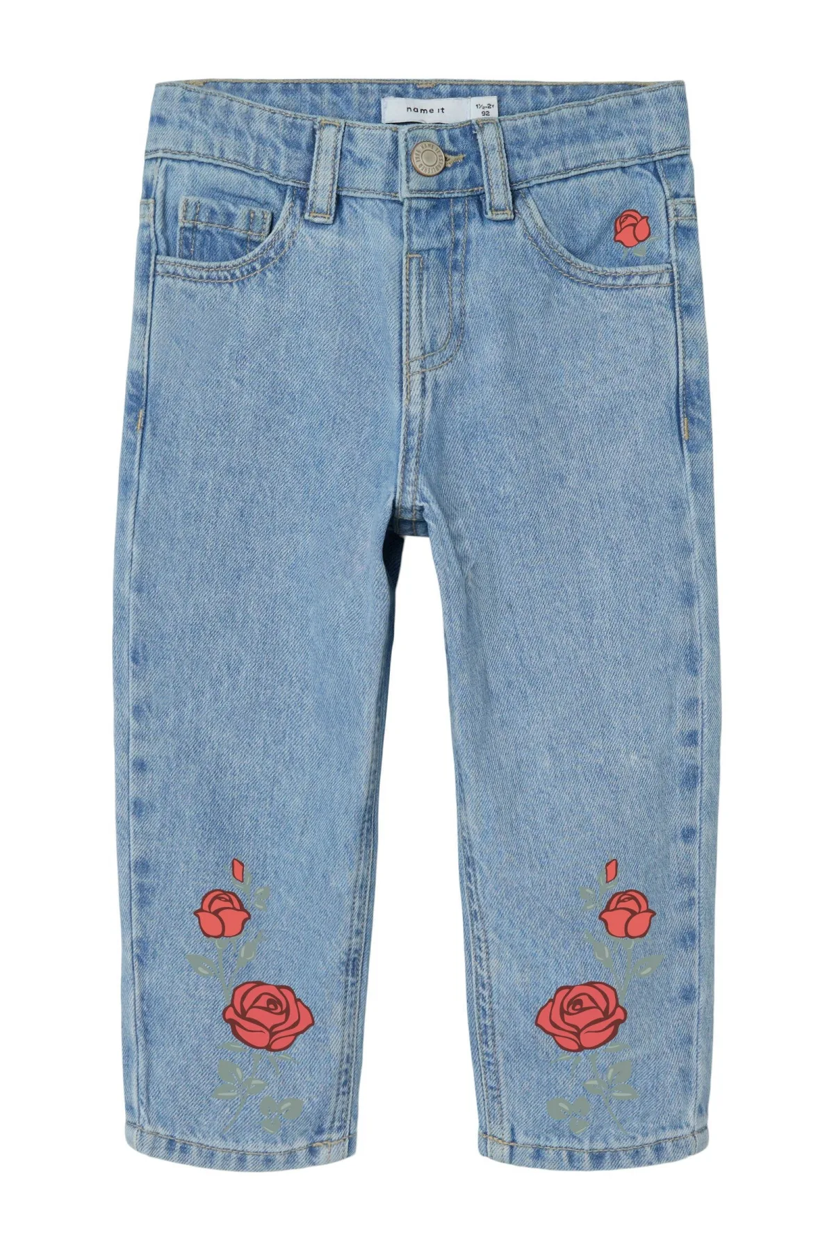 Deze NAME IT MINI NMFBELLA jeans is gemaakt van 100% katoen en heeft een mom fit. De denim heeft een regular waist en een drukknoopsluiting. Met borduursels en 5-pockets.