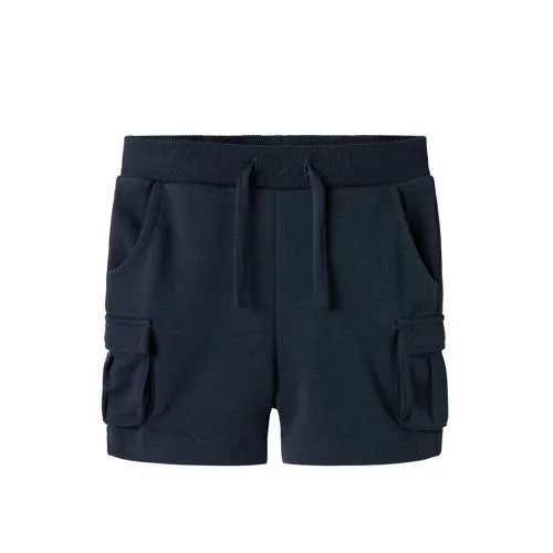 Deze donkerblauwe NAME IT MINI korte broek voor jongens heeft een elastische tailleband met koord. Gemaakt van katoen en polyester. Cargo- en sweatshorts met zakken voor en cargozakken. De taille is verstelbaar.