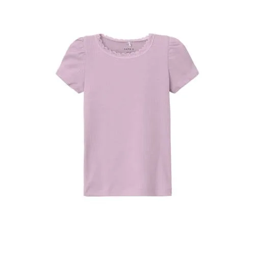 Dit NAME IT MINI T-shirt voor meisjes heeft een ronde hals en korte mouwen. Gemaakt van een blend van katoen, modal en elastaan. Het kant en rib breisel zorgen voor een charmante uitstraling.