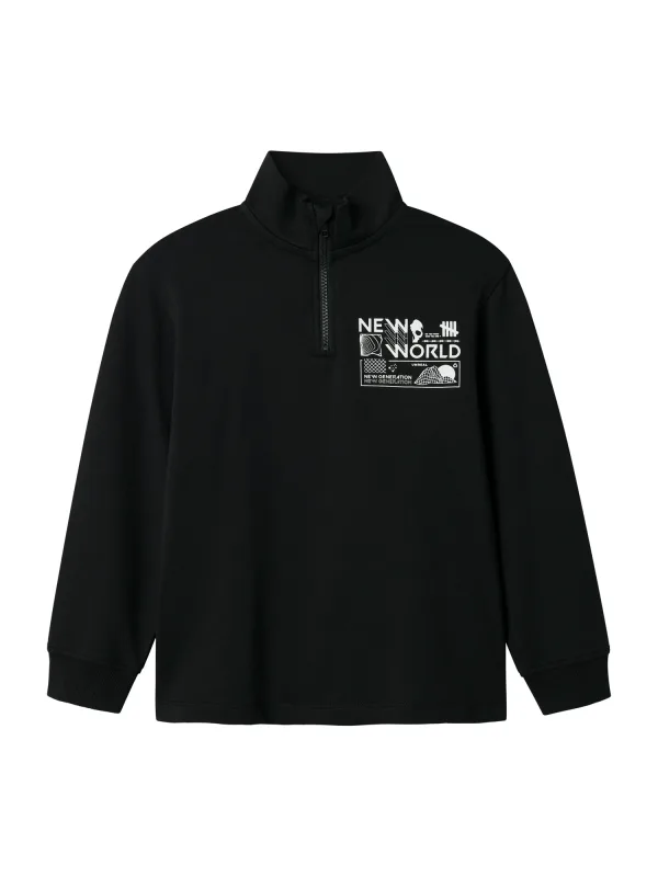 Design: Gevoerde zoom/rand, Rechte zoom, Halve rits; Type sluiting: Ritssluiting; Materiaal: Sweatstof; Halstype: Schipperskraag; Motief: Tekst print; Extra’s: Op staal naden, Voelt zacht aan; Pasvorm: Losse pasvorm; Armlengte: Lange mouw