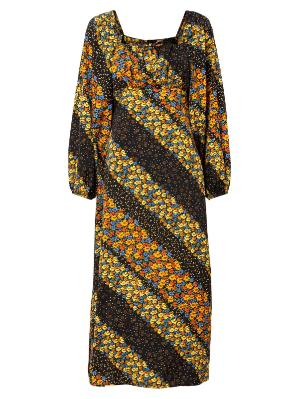 Design: Gevoerde zoom/rand, Elastische taille/zoom, Rechte zoom, Rug rits, Om te knopen/binden, Elastische inzetstukken, Uitgesneden rug; Type sluiting: Ritssluiting; Halstype: Carréhals; Motief: Bloemenprint; Details: Gedrapeerd; Extra's: All-over patroon, Voelt zacht aan; Lengte: 3/4 lengte; Pasvorm: Normale pasvorm; Armlengte: Lange mouw