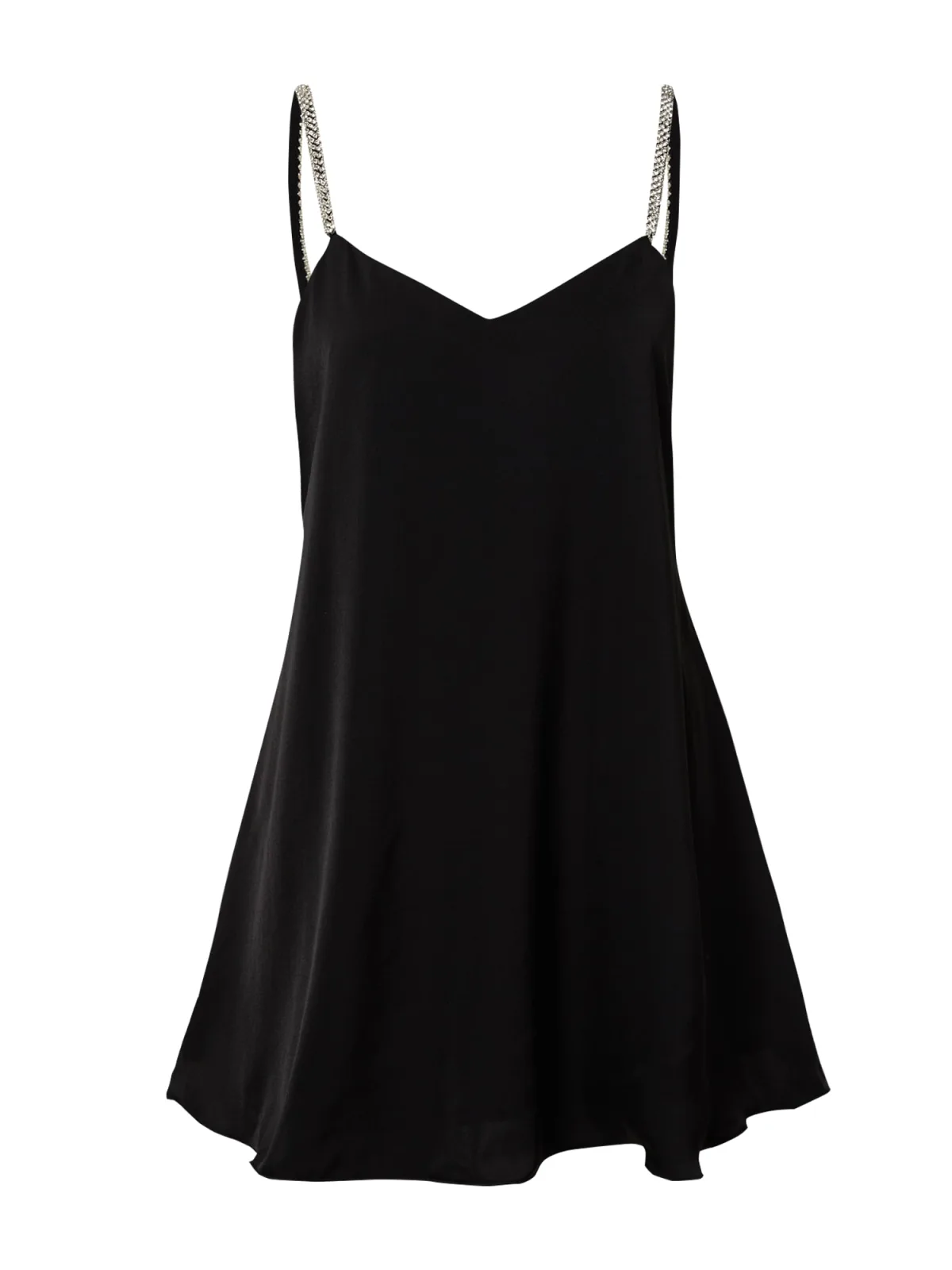 Design: Gevoerde zoom/rand, Flare, Rug rits, Uitgesneden rug; Type sluiting: Ritssluiting; Materiaal: Satijn; Halstype: V-hals; Motief: Effen; Soort bandjes: Spaghettibandjes; Details: Sierstenen; Extra's: Glitterend, Applicaties, Op staal naden, Gladde stof; Lengte: Kort/mini; Pasvorm: Losse pasvorm; Armlengte: Mouwloos
