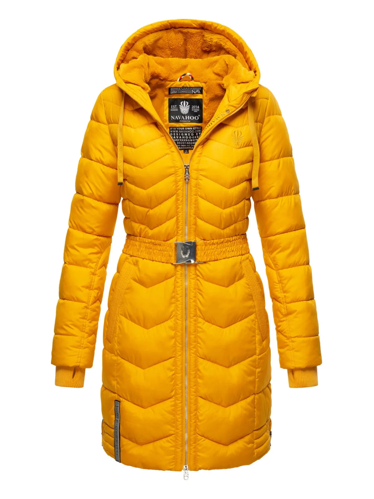 De Alpenveilchen van Navahoo is een extra lange dames winterjas met trendy zigzag-quiltdesign. Warm gevoerd en met zachte teddyfleece in de capuchon en bovenvoering, houdt hij je behaaglijk warm. De verstelbare tailleband zorgt voor een perfecte pasvorm, terwijl zijsplitten met rits extra bewegingsvrijheid bieden. Verkrijgbaar in 10 moderne kleuren, maten XS–XXL. Materiaal: buitenstof 100% nylon, voering/vulling 100% polyester
