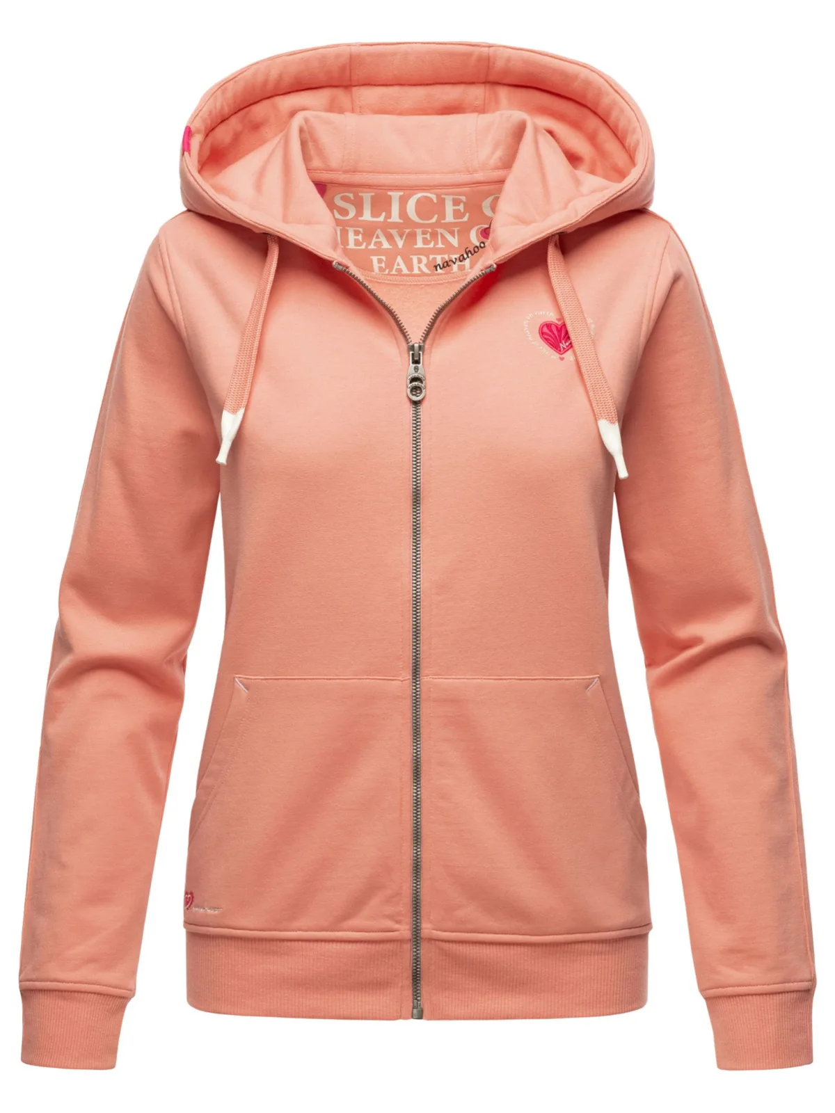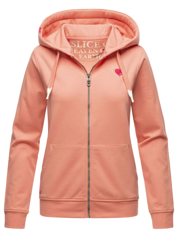 Het Cremetörtchen sweatvest van Navahoo biedt een combinatie van stijl, functionaliteit en draagcomfort. Gemaakt van een zachte katoen-polyestermix met warme voering en licht getailleerde pasvorm. Met grote capuchon met brede koord, hoge kraag, handige zakken en hartvormige logo-details is dit vest een echte favoriet. Verkrijgbaar in 6 moderne kleuren en maten XS–XXL. Materiaal: 48% katoen, 48% polyester, 4% elastaan; voering 100% polyester