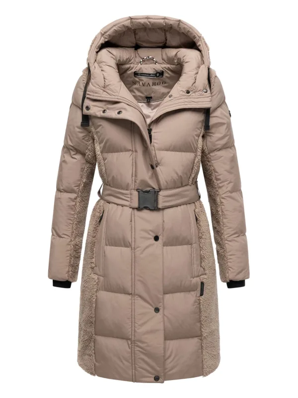 De Funkelteddy wintermantel van Navahoo combineert een urban look met betrouwbare warmte. De getailleerde, lange snit met geïntegreerde tailleband zorgt voor een elegante uitstraling. Mix van zacht teddyfleece op capuchon, schouders, rug en mouwen en glad, gewatteerd materiaal aan de voorkant biedt warmte en een moderne look. Met tweewegsrits, verborgen knopen, fleecegevoerde buitenzakken en hoge kraag. Praktisch dankzij een split en mooie logodetails. Verkrijgbaar in 8 kleuren en maten XS–XXL.