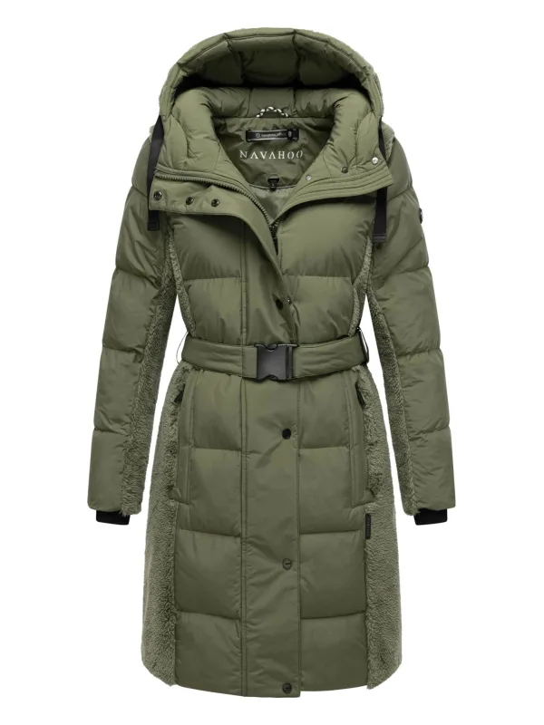 De Funkelteddy wintermantel van Navahoo combineert een urban look met betrouwbare warmte. De getailleerde, lange snit met geïntegreerde tailleband zorgt voor een elegante uitstraling. Mix van zacht teddyfleece op capuchon, schouders, rug en mouwen en glad, gewatteerd materiaal aan de voorkant biedt warmte en een moderne look. Met tweewegsrits, verborgen knopen, fleecegevoerde buitenzakken en hoge kraag. Praktisch dankzij een split en mooie logodetails. Verkrijgbaar in 8 kleuren en maten XS–XXL.