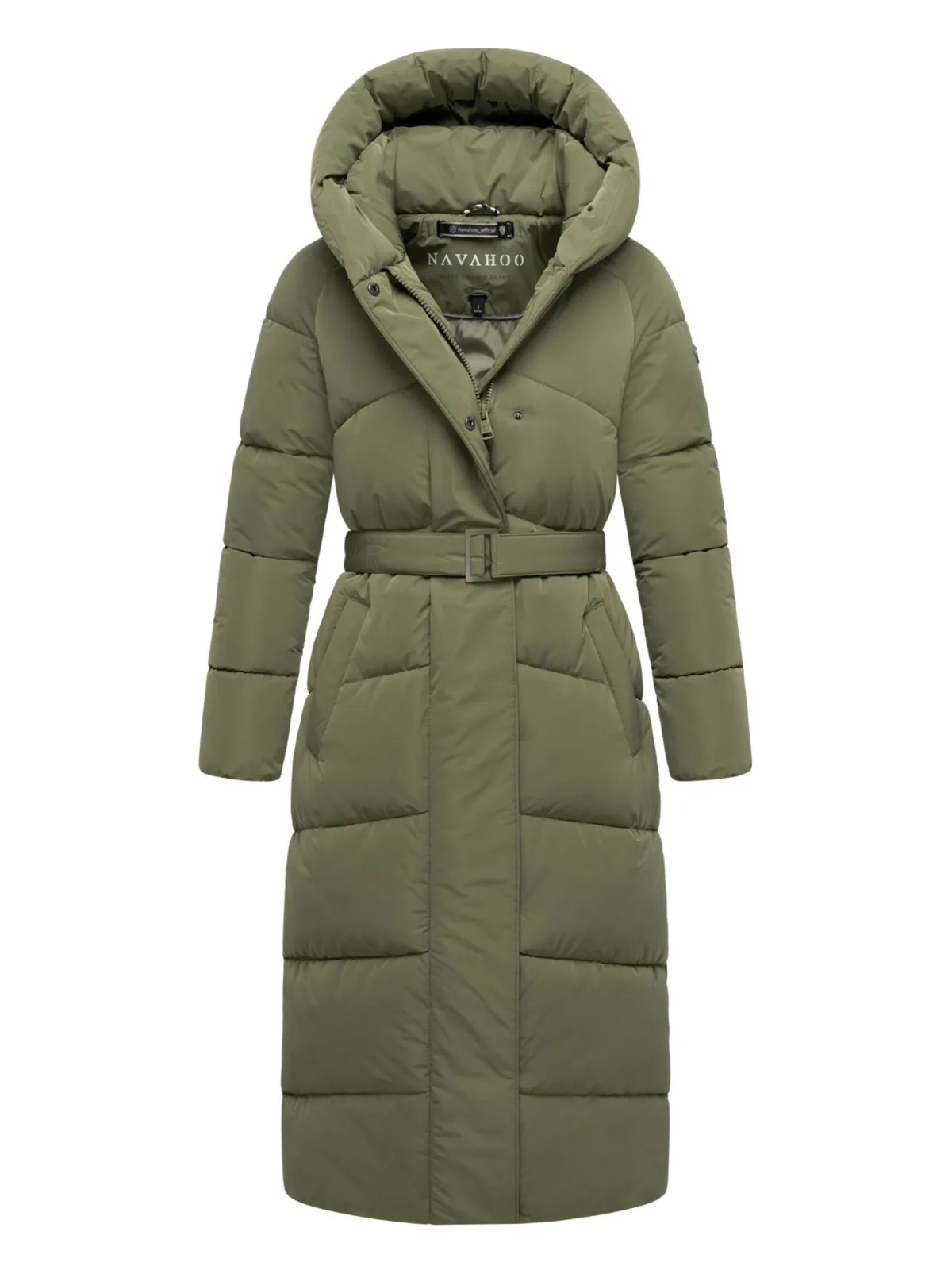 De Eisblick gewatteerde mantel van Navahoo combineert stijlvol design met warmte en functionaliteit. Een vaste capuchon, hoge kraag en winddichte afwerking beschermen tegen kou. De tailleriem en diagonale stiksels zorgen voor een flatterend silhouet. Praktische zakken en elastische boorden maken het geheel compleet. Verkrijgbaar in 7 kleuren en maten S–XXL.