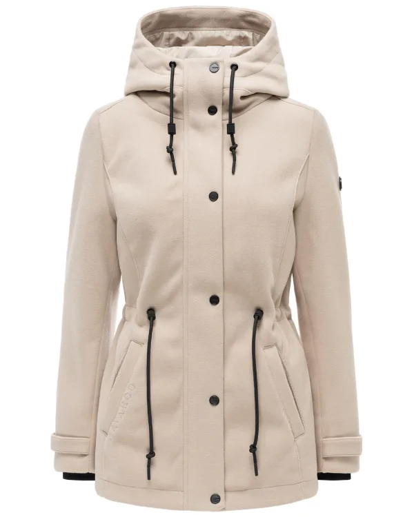 De Navahoo Lächelstern tussenjas voor dames combineert een modern vrouwelijk design met hoog draagcomfort voor het tussenseizoen. De elegante wol-look geeft de jas een stijlvolle uitstraling, terwijl het zachte buitenmateriaal van 100% polyester aangenaam warm houdt. De vaste capuchon beschermt tegen wind tijdens koelere dagen in lente en herfst. De doorlopende ritssluiting met knoopsluiting zorgt voor een veilige sluiting. Dankzij de licht getailleerde pasvorm met verstelbaar taillekoord ontstaat een mooie silhouet. Zijzakken met fleecevoering en een open binnenzak bieden praktische opbergruimte. Verstelbare manchetten maken het ontwerp compleet. Ideaal voor dagelijks gebruik en vrije tijd. Materiaal: 100% polyester.