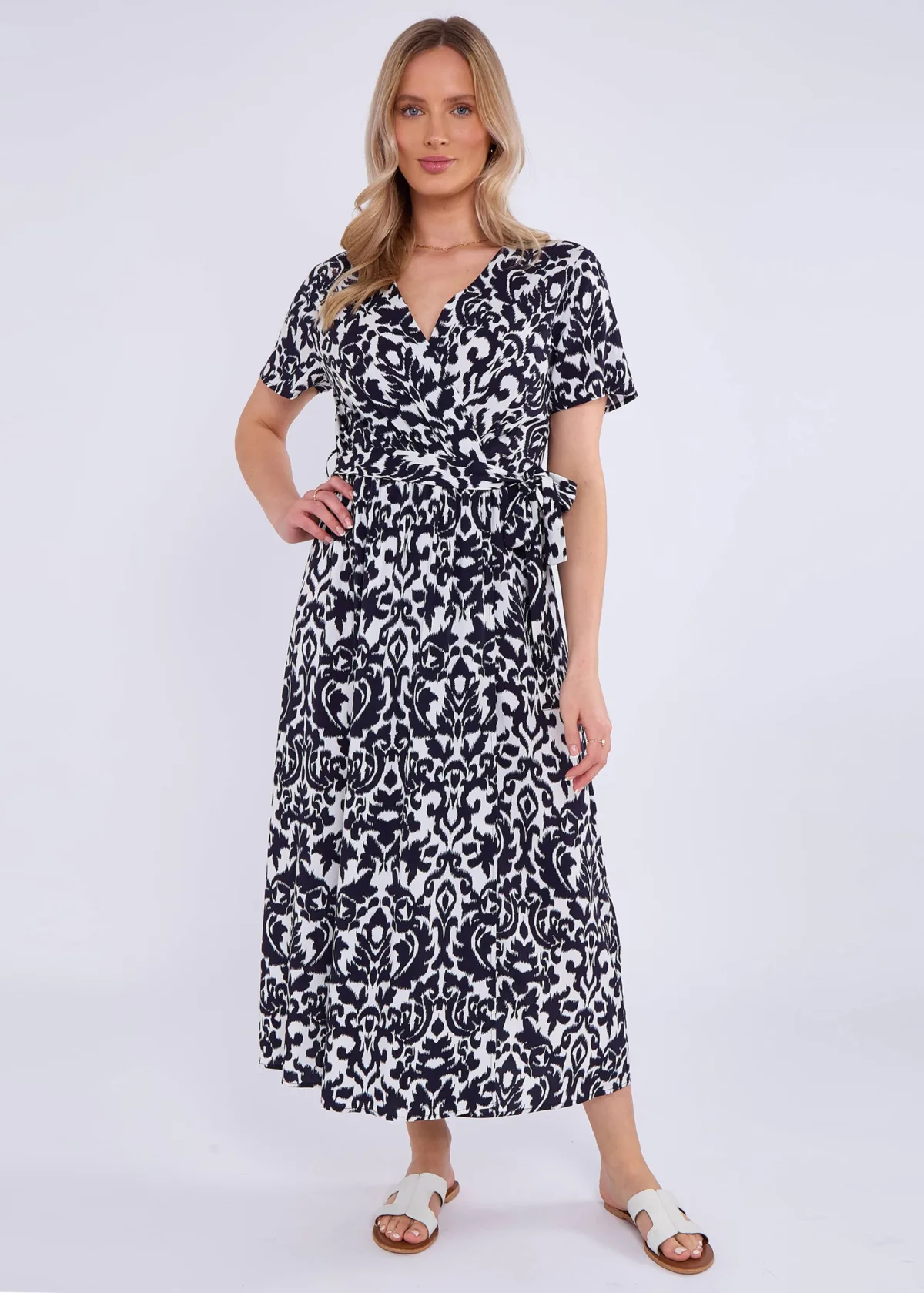 - De laagste prijs van Navy korte mouwen viscose wikkel midi jurk werd gevonden op 25 april 2026 16:23.