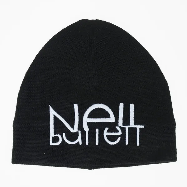 Neil Barrett muts met gesneden logo, zwarte hoed. Neil Barrett muts met gesneden logo, zwarte hoed. 50% Wol 50% Acryl. Uitrekkende pasvorm. PBCP247 H9563 524. Gemaakt in Italië