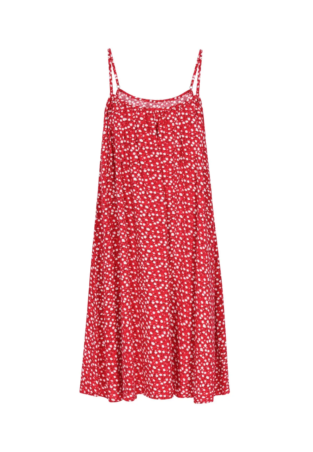 Design: Flare; Materiaal: Viscose; Motief: Bloemenprint; Soort bandjes: Spaghettibandjes; Details: Gedrapeerd; Extra's: All-over patroon; Lengte: Kort/mini; Pasvorm: Losse pasvorm; Armlengte: Mouwloos