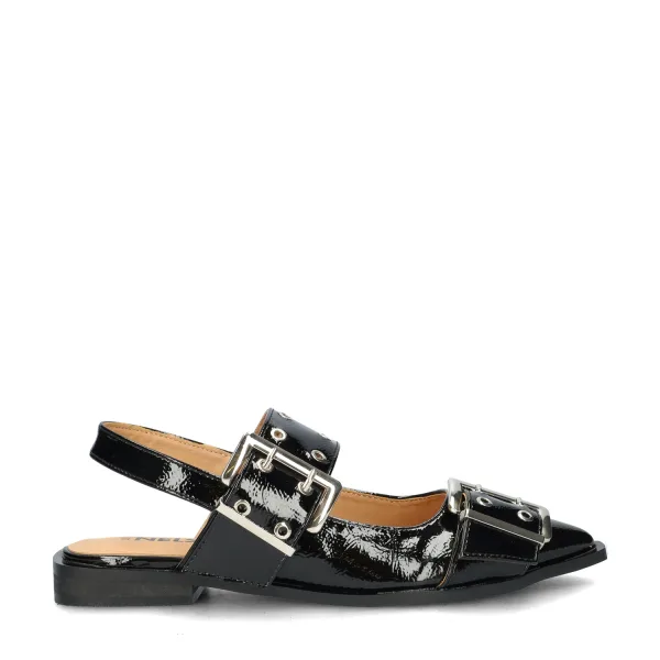 Nelson dames instapper Deze trendy slingback geeft een edge aan je look, durf jij hem aan? Uitgevoerd in lak wat voor een eyecatching look zorgd. De chunky buckles geven deze slingback een edgy look. Gevoerd met imitatieleer. Voorzien van een voetbed van imitatieleer. Dankzij het dempend kussen over de lengte van de voet loop je de hele dag comfortabel. Afgewerkt met een rubberen loopzool. Let op! Dit artike valt kleiner uit, we adviseren een maat groter te bestellen