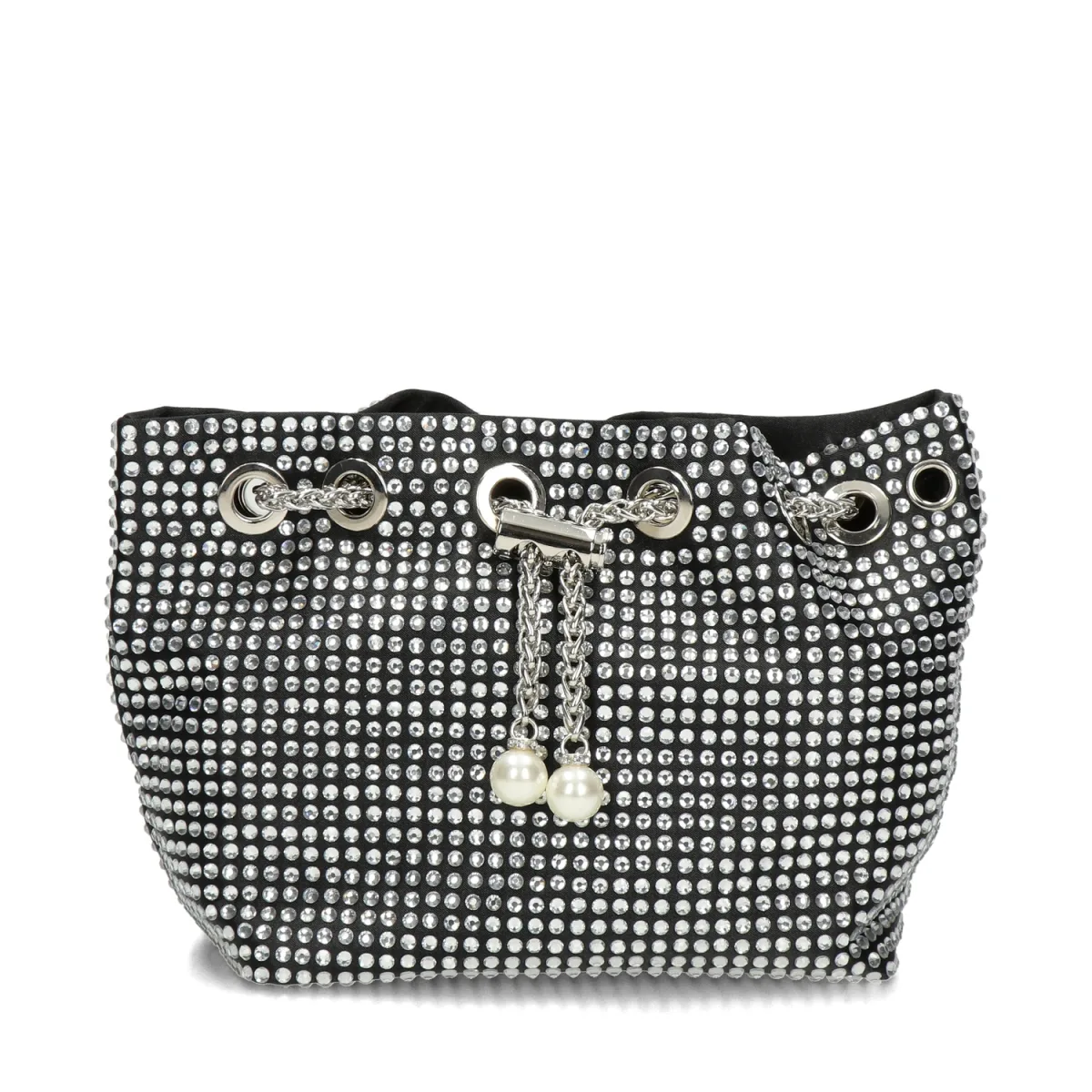 Nelson schoudertas Bij een feestelijke outfit hoort natuurlijk een bijpassende tas. Deze kleine tas is perfect voor een feestje of avondje uit. Uitgevoerd in textiel en volledig bedekt met glinsterende strass-streentjes. Det as bestaat uit één vak die afsluitbaar is meet een leuk aantrekkoord. Afmetingen: 24x15x10 cm.