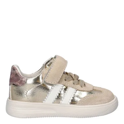 Met deze Nelson Kids meisjes sneaker krijgt elke outfit een speelse, glanzende touch. De goudkleurige schoen heeft subtiele suède details en is een fijne combinatie van stoer en sierlijk. Ideaal voor kinderen die graag een beetje opvallen en toch comfortabel willen kunnen rennen, spelen en springen.Comfort en gemak voor kleine voeten Bovenkant gemaakt van leer met imitatieleer en suède details voor een stevige maar soepele pasvorm Elastische veters en klittenbandsluiting zodat kinderen de sneaker makkelijk zelf aan en uit doen Gevoerd met zacht imitatieleer voor een prettig gevoel rondom de voet Leren voetbed dat lichte demping geeft bij elke stap Rubberen loopzool met platte zool en hakhoogte van 2,5 cm voor goede grip en stabiliteit Normale leest, geschikt voor de meeste kindervoeten Laag model dat goed aansluit om de enkel en makkelijk te combineren is met verschillende outfitsGouden sneakers voor elke dagDe goudkleurige Nelson Kids meisjes sneaker uit de Daily collectie is gemaakt voor alledaags draagplezier. Naar school, de opvang of een middag buitenspelen, de stevige rubberen zool en het dempende voetbed zorgen voor comfort gedurende de dag. De glanzende kleur maakt er een opvallend paar van dat eenvoudig te combineren is met een jeans, legging of jurkje.Nelson Kids, gemaakt voor spel en bewegingNelson Kids richt zich op schoenen met een stevige constructie die aansluiten bij het dagelijkse leven van actieve kinderen. Materialen en pasvorm worden geselecteerd met aandacht voor draagcomfort, zodat kinderen zich vrij kunnen bewegen. Zo combineert Nelson Kids praktische details met een eigentijdse look.Geschikt voor wie zoekt naar comfortabele, goudkleurige sneakers die kinderen elke dag kunnen dragen.