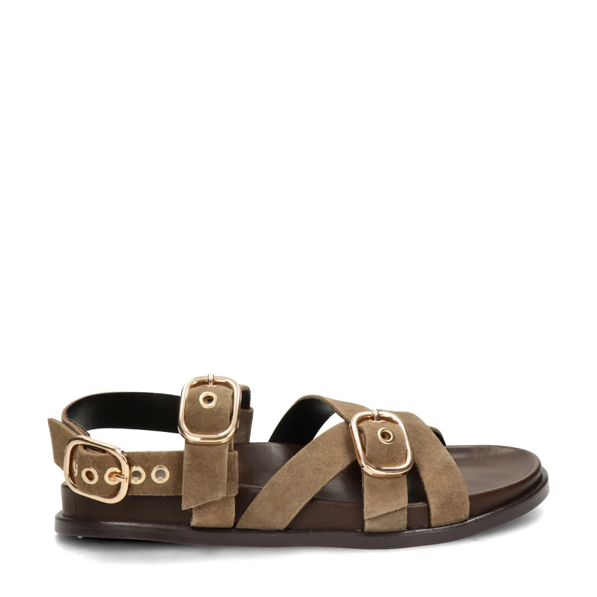 Nelson dames sandaal Deze stoere sandaal uit onze Nelson-collectie geeft eens ruw randje aan je look. Uitgevoerd in ruw suède wat de sandaal een rustieke look geeft. De opvallende gespen geven niet alleen een robuuste uitstraling, maar zorgen er ook voor dat je de sandaal op drie punten kunt verstellen. Gevoerd met imitatieleer. Voorzien van een voorgevormd voetbed die steun aan de voetboog biedt tijdens het lopen. De leren toplaag houdt de voeten koel, zelfs op de warmere dagen. Afgewerkt met een rubberen loopzool.