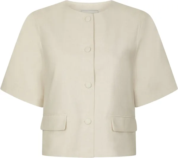 Blouse Rory Linen van Neo Noir heeft een minimalistische, verfijnde uitstraling met kraagloze halslijn, korte mouwen en regular pasvorm. De effen stof en blinde knoopsluiting zorgen voor een strakke lijn. Zakken op de voorzijde voegen gemak toe. Draag netjes met een pantalon of rok.