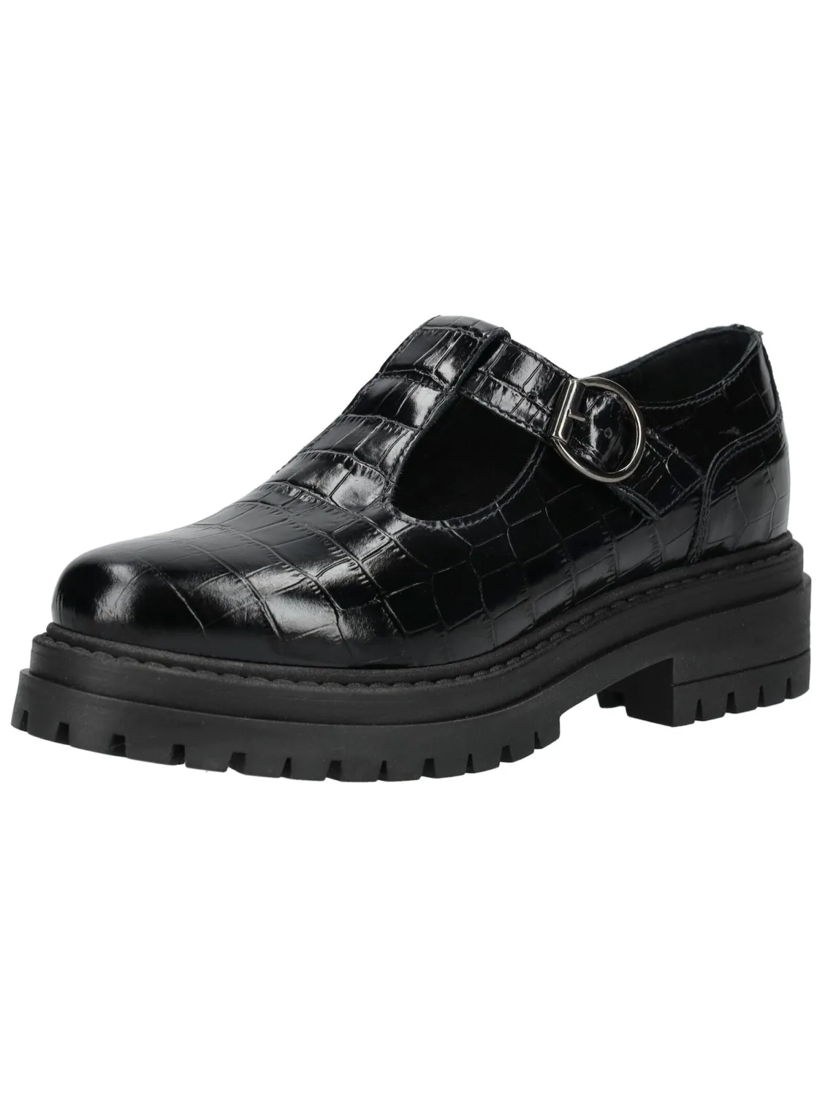 Design: Profielzolen; Type sluiting: Gesp; Type hak: Blokhak; Materiaal: Leer; Motief: Effen; Materiaal: Glad leer; Schoenneus: Ronde neus; Extra’s: Op staal naden, Reptile look; Hakhoogte: Middelhoge hak (3-7 cm)