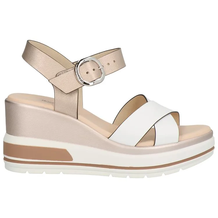 Prachtige sandaal van NeroGiardini. Mooie kleurencombinatie die makkelijk combineert. Door de Plateau draagt de hakhoogte toch comfortabel. De kruisband over de voorvoet sluit mooi aan en de band over de wreef is verstelbaar met een gespje. Bekijk ook onze overige collectie van NeroGiardini op onze webshop!