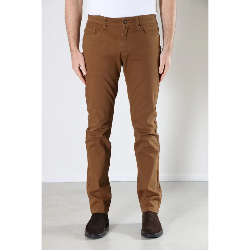 Deze camelkleurige slim-fit broek heeft stretch. Doordat deze broek uit 98% katoen en 2% elastaan bestaat, draagt deze broek erg comfortabel. De broek is voorzien van een YKK rits en vier zakken.