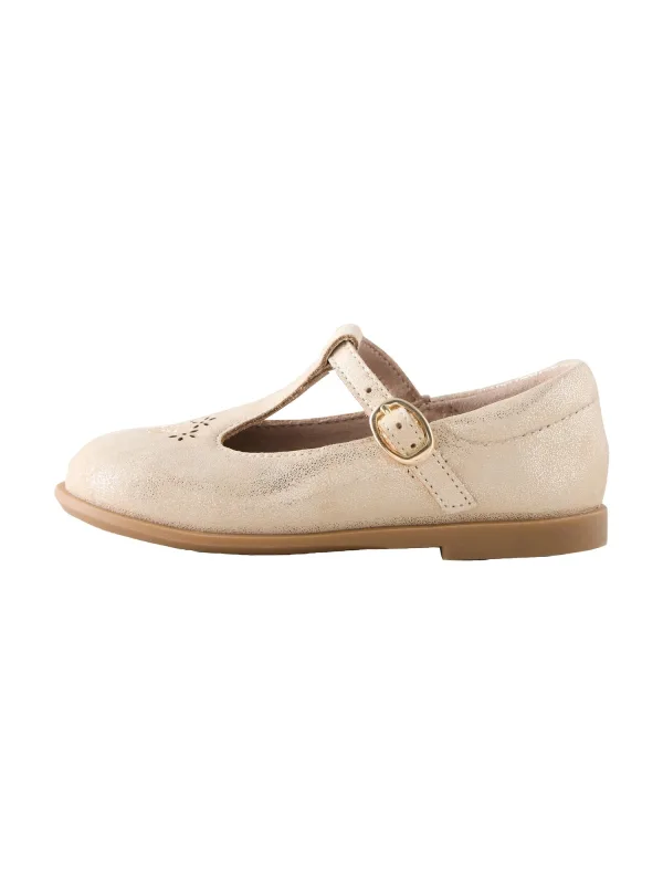 Design: T-strap; Type sluiting: Riemsluiting; Materiaal: Leer; Motief: Effen; Materiaal: Glad leer; Schoenneus: Ronde neus; Extra's: Glitterend; Hakhoogte: Platte hak (0-3 cm)