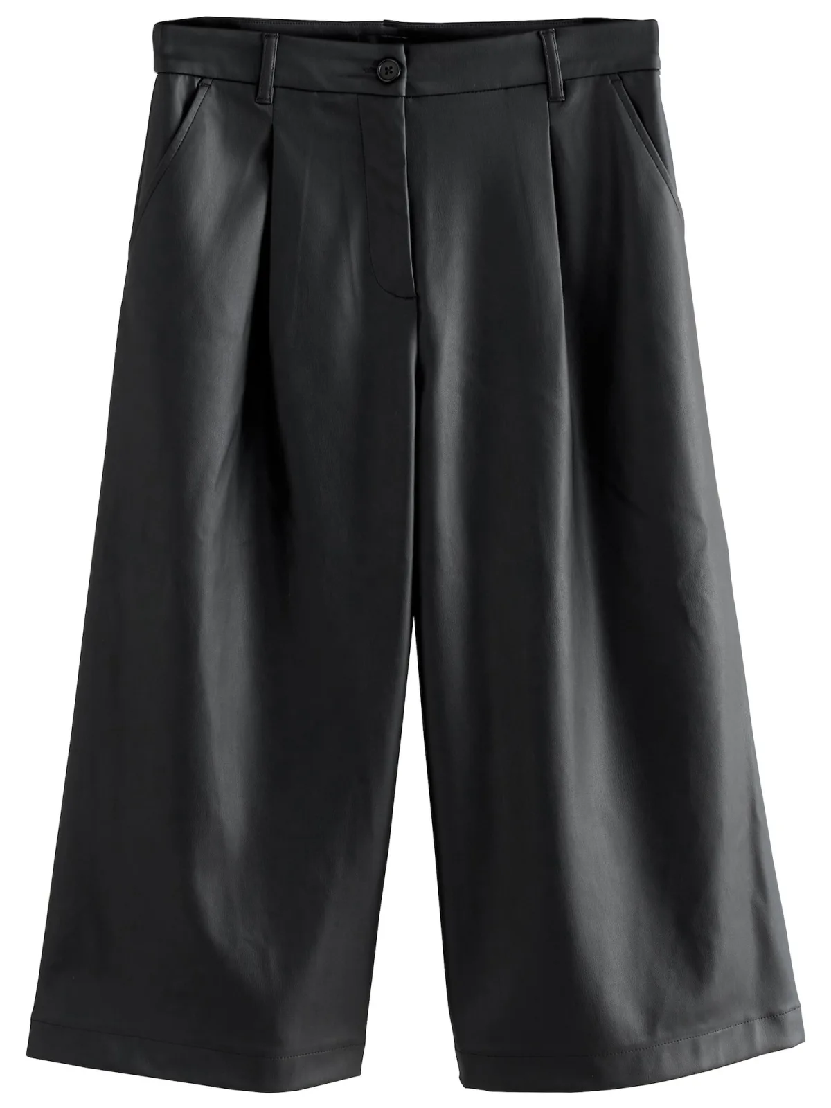 Design: Zakken aan de zijkant, Knop sluiting; Type sluiting: Ritssluiting; Materiaal: Imitatieleder; Motief: Effen; Details: Plooien; Extra's: Op staal naden, Riemlussen; Lengte: 3/4 lengte; Pasvorm: Wide leg; Taillehoogte: Mid waist