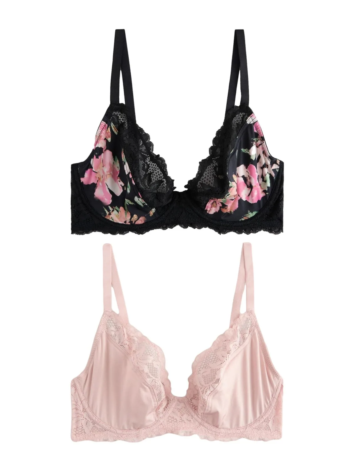 Cup soorten: Full cup bh; Soort bandjes: Normale bandjes; Bh/bikini type: T-shirt; Beugel: Met beugel; Design: Geschulpte zoom; Type sluiting: Haakjes; Motief: Bloemenprint; Details: Kant; Extra's: Gladde stof; Aantal: 2 Pack
