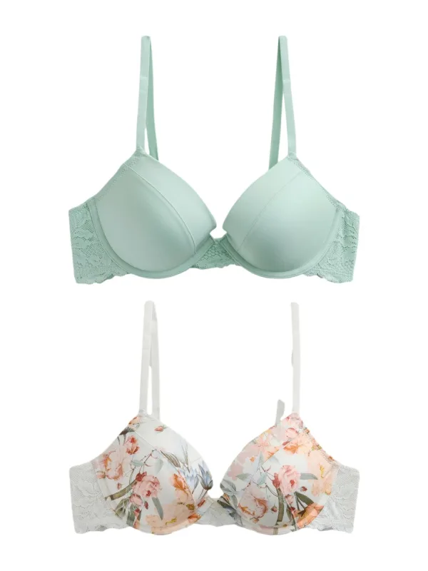 Cup soorten: Demi cup bh; Bh/bikini type: Push-up; Beugel: Met beugel; Design: Elastische taille/zoom; Type sluiting: Haakjes; Motief: Bloemenprint; Details: Kant; Extra's: Verstelbare bandjes; Aantal: 2 Pack
