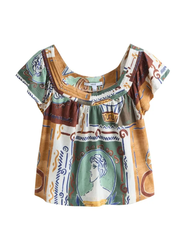 Blouse type: Blouseshirt; Design: Ingelegde kraag, Brede mouwopeningen; Materiaal: Katoen; Kraag: Zonder kraag; Details: Gedrapeerd; Extra's: All-over patroon, Biezen, Voelt zacht aan; Pasvorm: Normale pasvorm; Armlengte: Kwartmouw; Lengte: Normale lengte