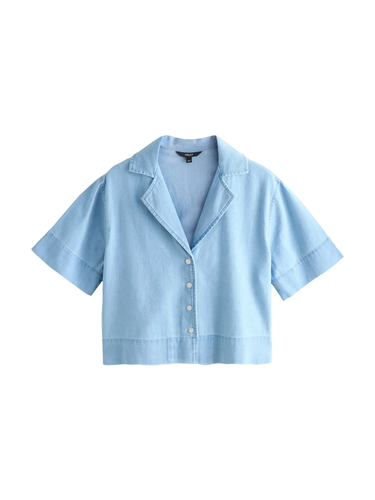 Blouse type: Klassieke blouse; Design: Revers kraag; Type sluiting: Knoopsluiting; Materiaal: Denim; Motief: Effen; Extra's: Vaste grip; Pasvorm: Normale pasvorm; Armlengte: Halve mouw; Lengte: Korte pasvorm